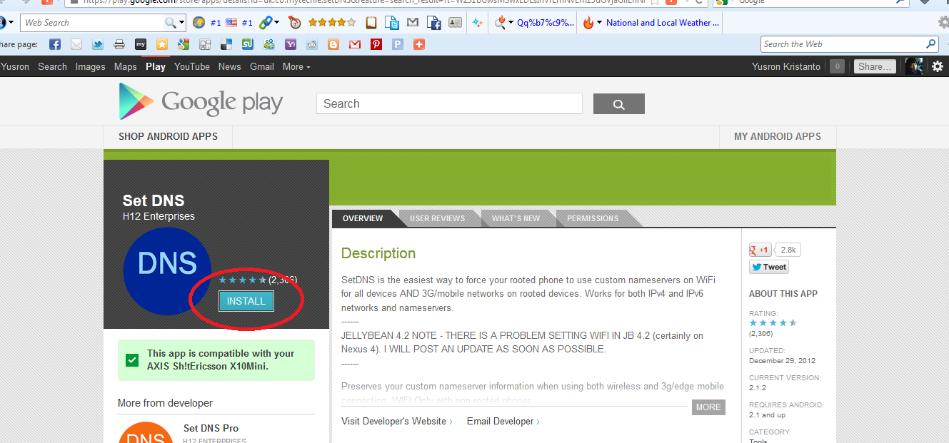 Selanjutnya buka Google Play menggunakan browser komputer anda. Disana anda bisa memilih atau mencari aplikasi macam apa yang ingin anda install di android anda, sebagai contoh berhubung saya sedang mencari aplikasi untuk merubah DNS ponsel saya maka saya search di kotak search dan saya temukan aplikasi bernama Set DNS.