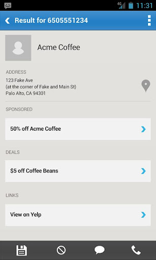 Ketika Anda mendapatkan panggilan dari lini bisnis, Mr. Number melakukan Caller ID bebas lookup untuk mencari nama. Jika kita tahu siapa yang dipanggil, kita akan menampilkan informasi tentang business, termasuk penawaran yang mereka miliki, lokasi mereka dan link ke situs Web mereka. (Anda juga dapat memblokir bisnis dari menelepon Anda dengan sekali tekan.)