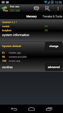This application optimizes the RAM of all android devices and improves the performance in all directions. We tested the best RAM balance which makes your system as fast as possible. Lots of running applications with enough free memory will not be a problem for your device. This is the best solution for all who have problem with the free memory, with the multitasking, with slow swapping between applications or with low performance.